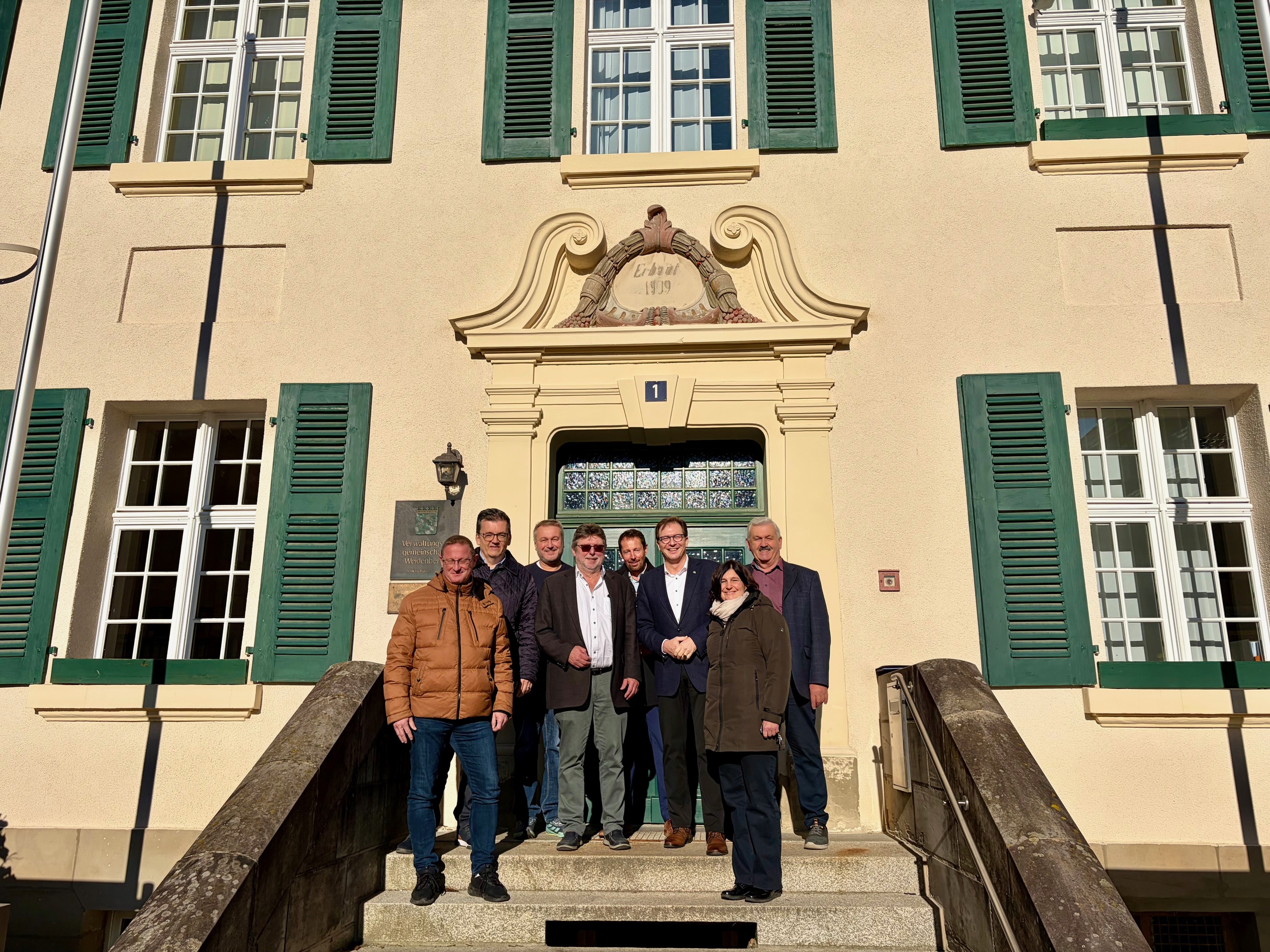 Die Gesprächsrunde auf der Treppe des historischen Rathauses Weidenberg – Stefan Roder, 2. Bgm und CSU-Ortsvorsitzender Seybothenreuth, Gerhard Herrmannsdörfer, 1. Bgm Emtmannsberg, Klaus Bauer, Geschäftsstellenleiter der Verwaltungsgemeinschaft Weidenberg, Hans Wittauer, 1. Bgm Weidenberg, Matthias Böhner, 3. Bgm Weidenberg, MdL Franc Dierl, Cornelia Angerer-Daum, CSU-Ortsvorsitzende Weidenberg, Reinhard Preißinger, 1. Bgm Seybothenreuth (von links nach rechts).