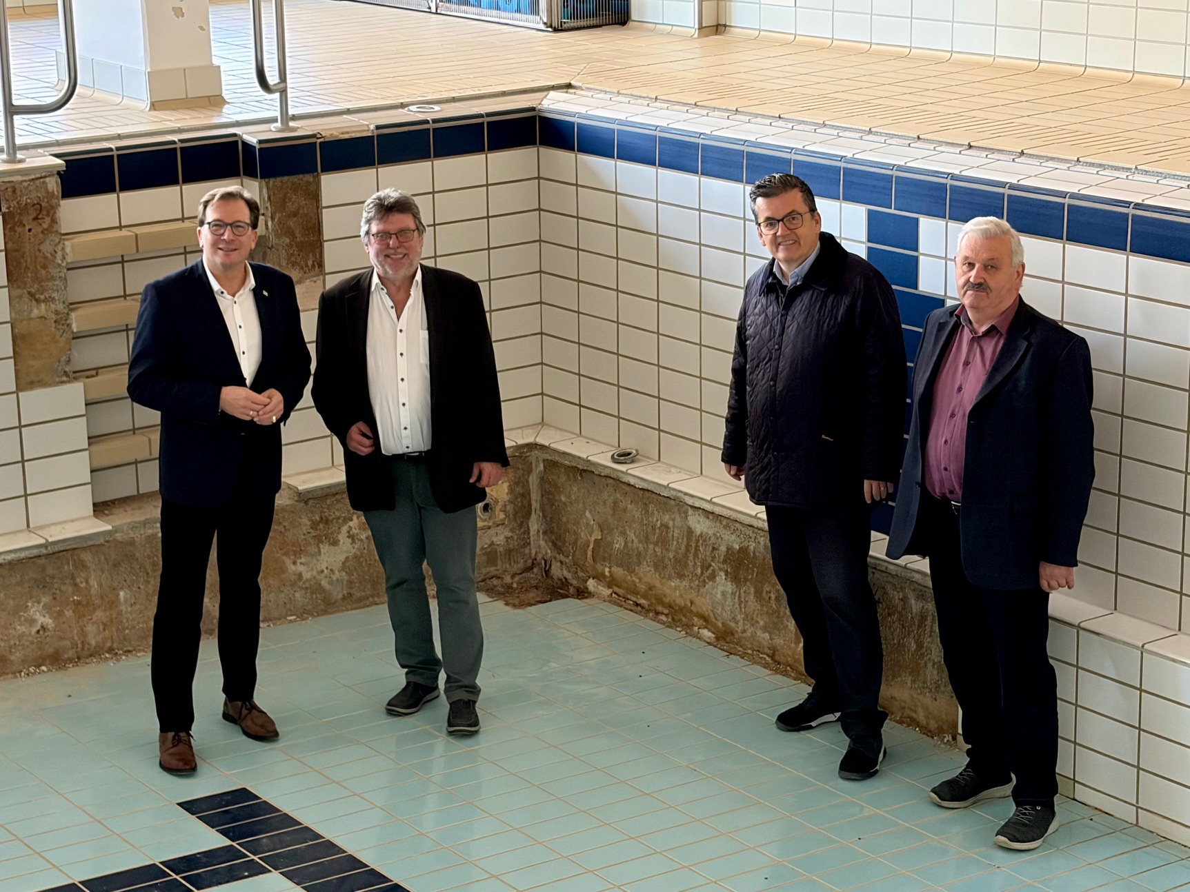 MdL Franc Dierl, Hans Wittauer, 1. Bgm Weidenberg, Gerhard Herrmannsdörfer, 1. Bgm Emtmannsberg, Reinhard Preißinger, 1. Bgm Seybothenreuth (von links nach rechts) im Schwimmbecken des Schulhallenbades in Weidenberg, das gerade neu gefliest wird.