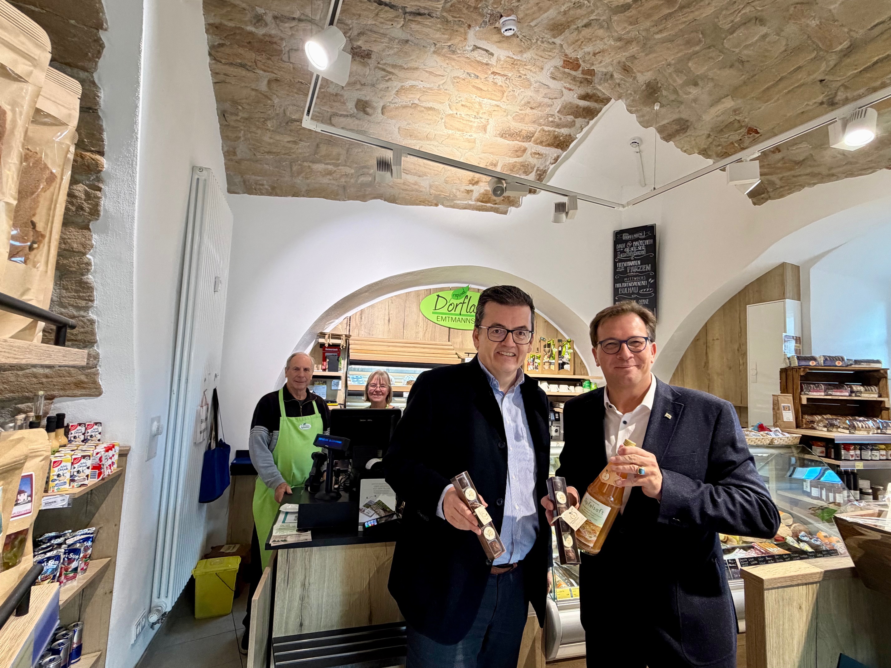 Besuch im Dorfladen in Emtmannsberg - Gerhard Herrmannsdörfer, 1. Bgm Emtmannsberg, MdL Franc Dierl, im Hintergrund zwei ehrenamtliche Mitarbeiter des Dorfladens.