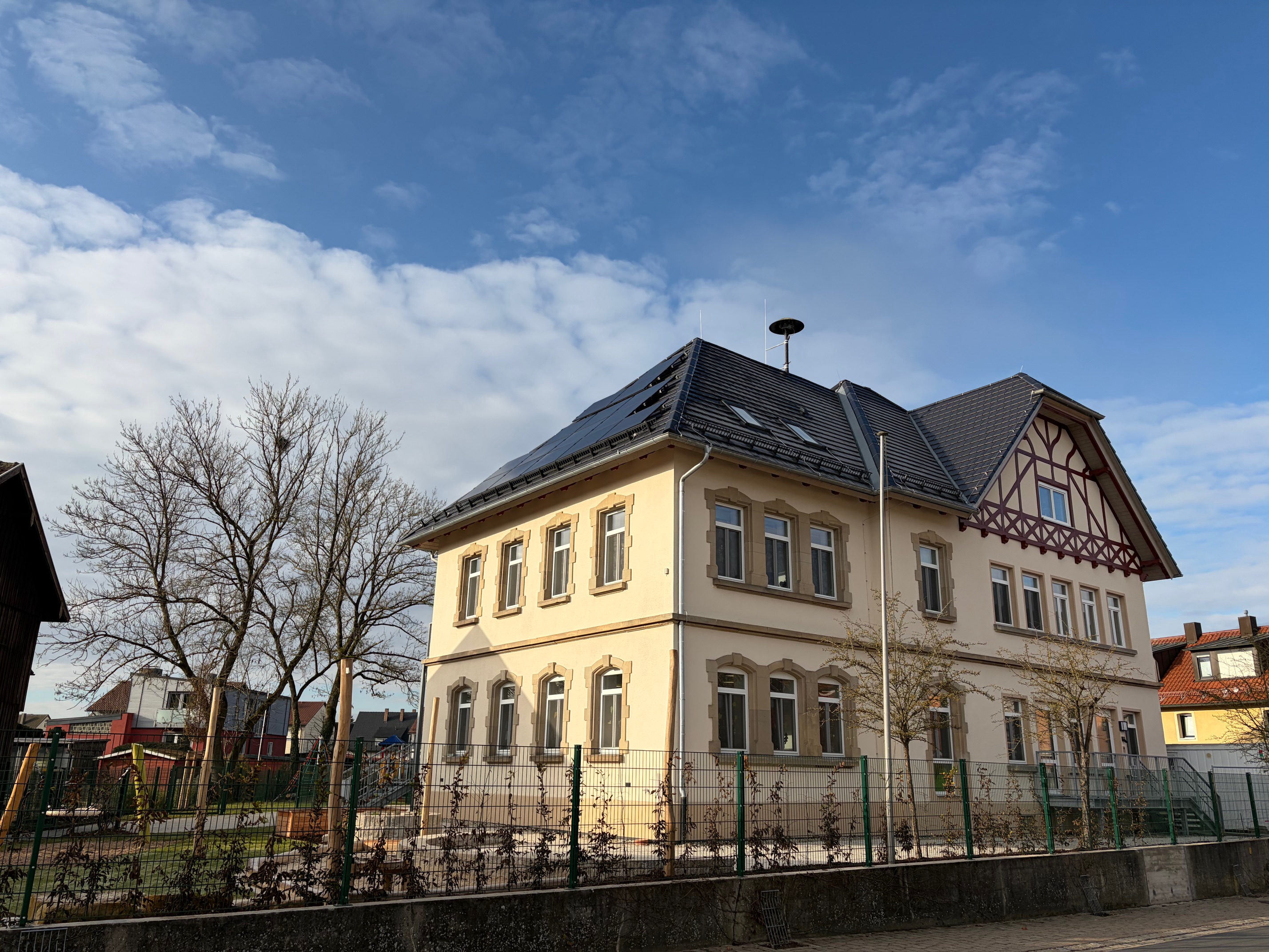 Außenansicht der KiTa, dem ehemaligen Schulhaus von Speichersdorf, das in ein modernes, nachhaltig gebautes Gebäude umgebaut wurde, das auch energetisch auf dem neuesten Stand ist.