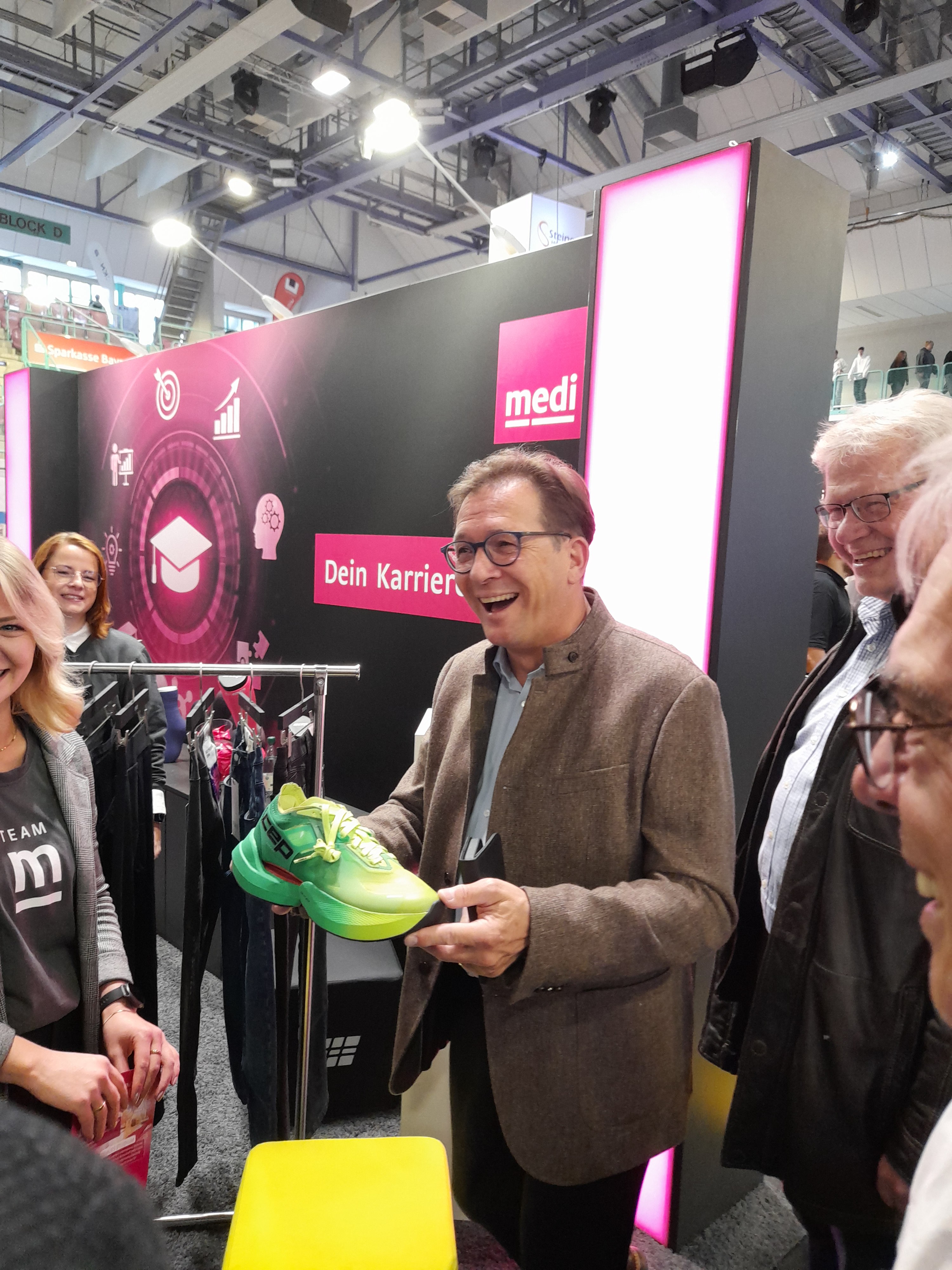 MdL Franc Dierl besichtigt auf einem Messerundgang u. A. die Stände der Firmen Zapf und Medi.