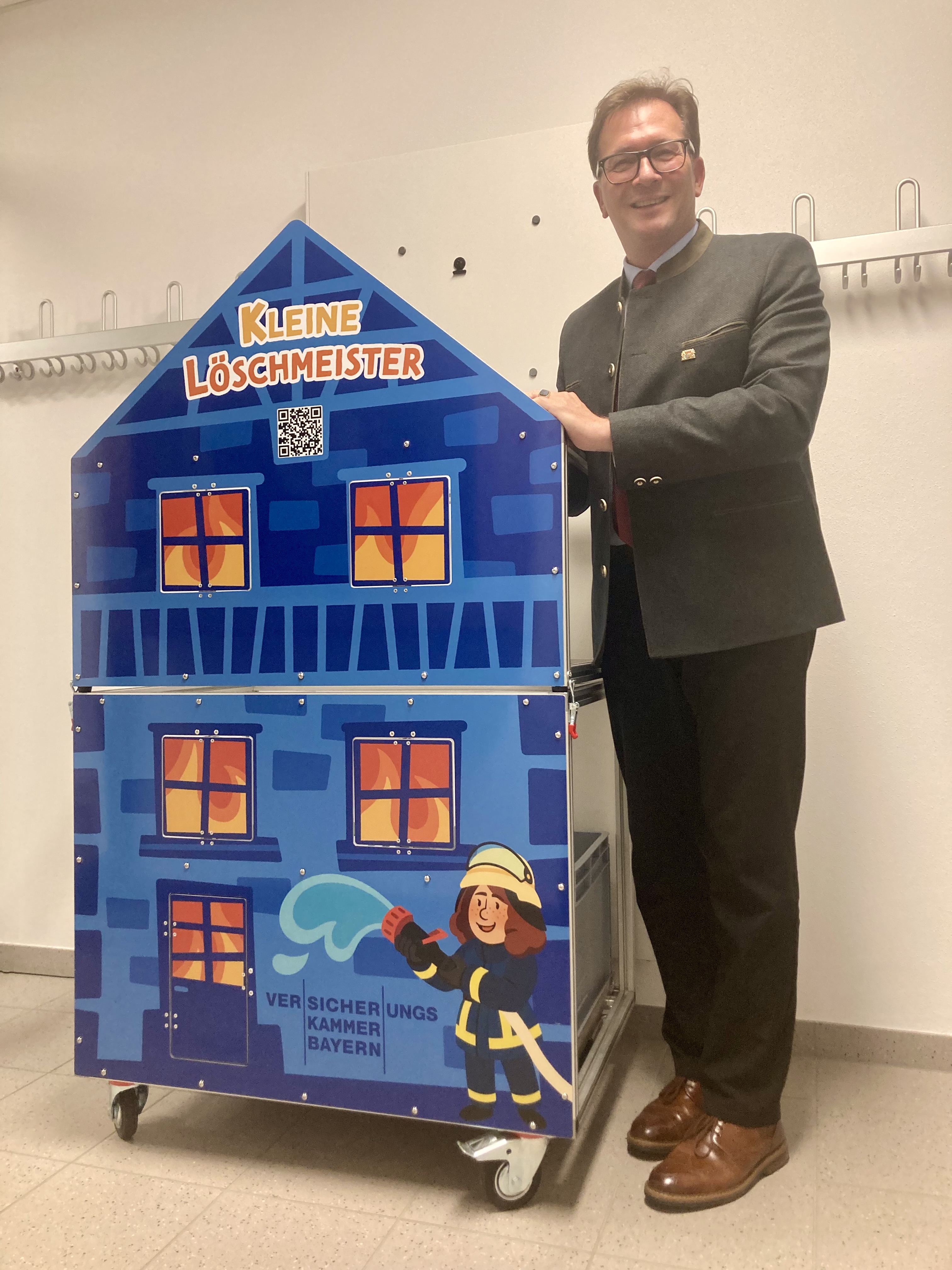 Dierl vor der Kinderspritzwand, die von der Bayerischen Versicherungskammer gesponsert und nach und nach in allen Ortsgruppen verteilt und eingesetzt werden.
