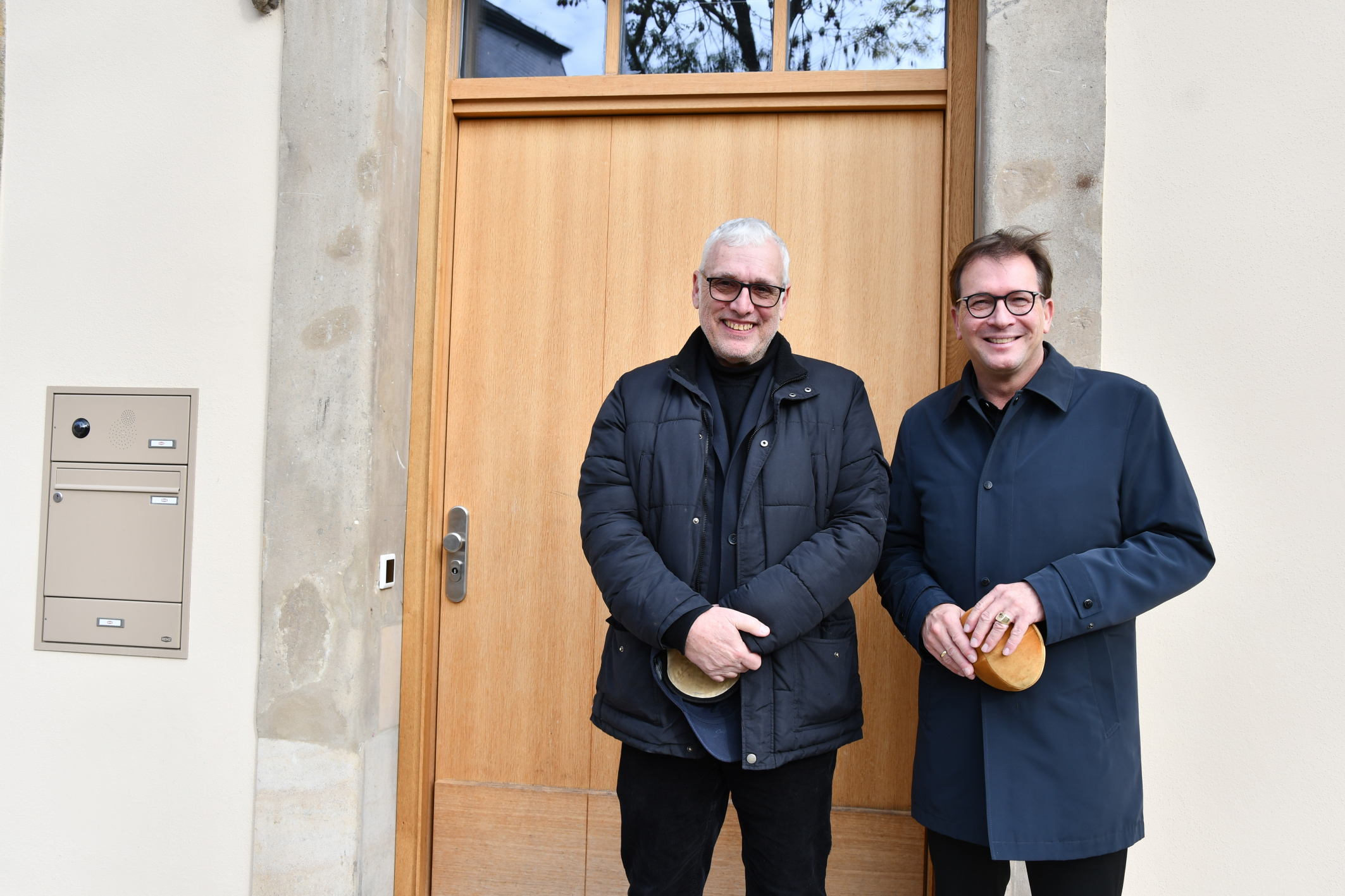 Hier geht es künftig in das jüdische Gemeindezentrum: Der Vorsitzende der Israelitischen Kultusgemeinde Felix Gothart (links) mit dem Landtagsabgeordneten Franc Dierl am Eingang zu den neuen Veranstaltungsräumen.