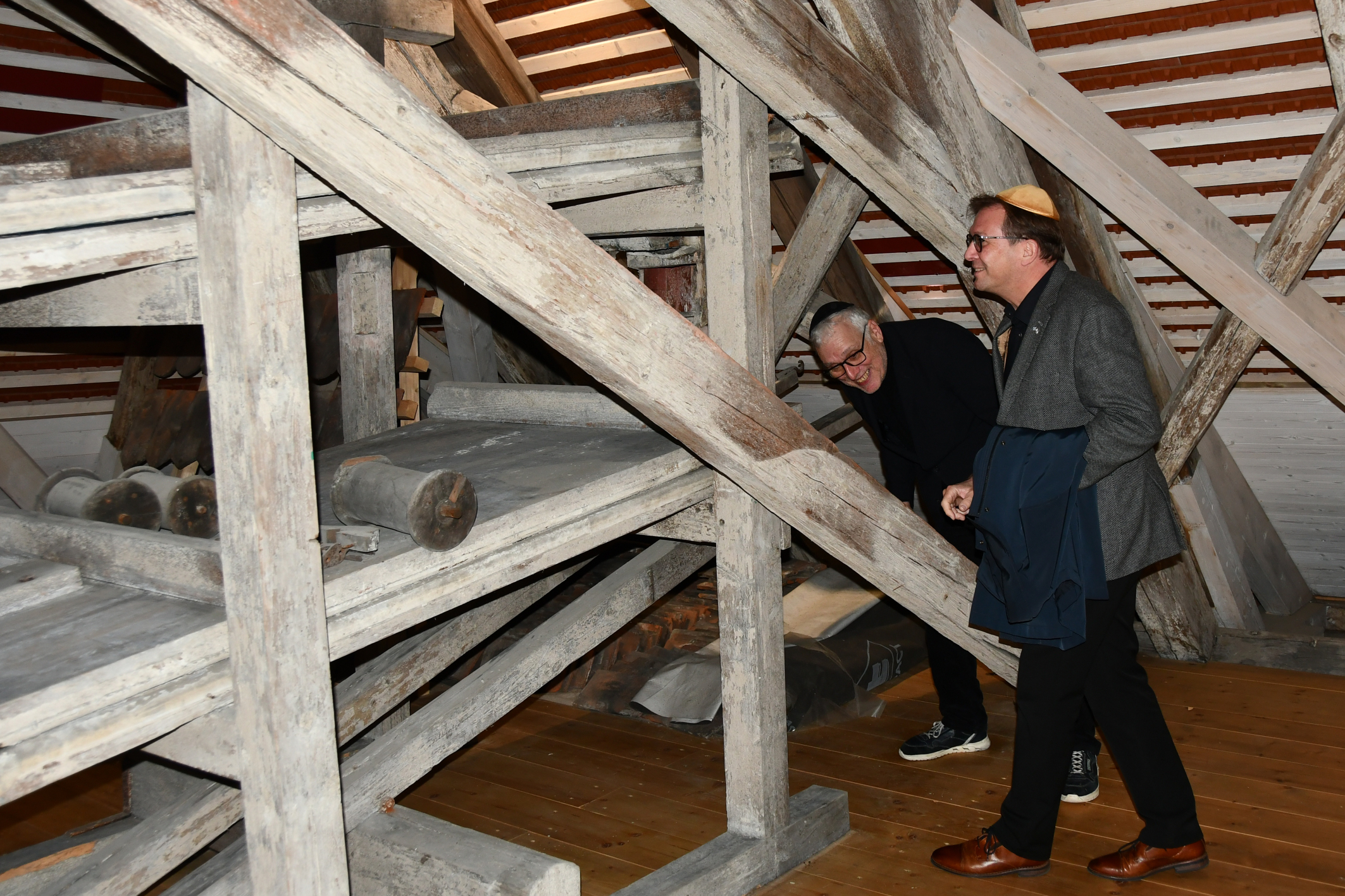 So manche Überraschungen birgt der Dachboden der Synagoge in der Münzgasse. Der Vorsitzende der israelitischen Kultusgemeinde Felix Gothart (links) zeigt dem Landtagsabgeordneten einen riesigen Blasebalg, der einst wohl Teil einer barocken Bühnentechnik war.