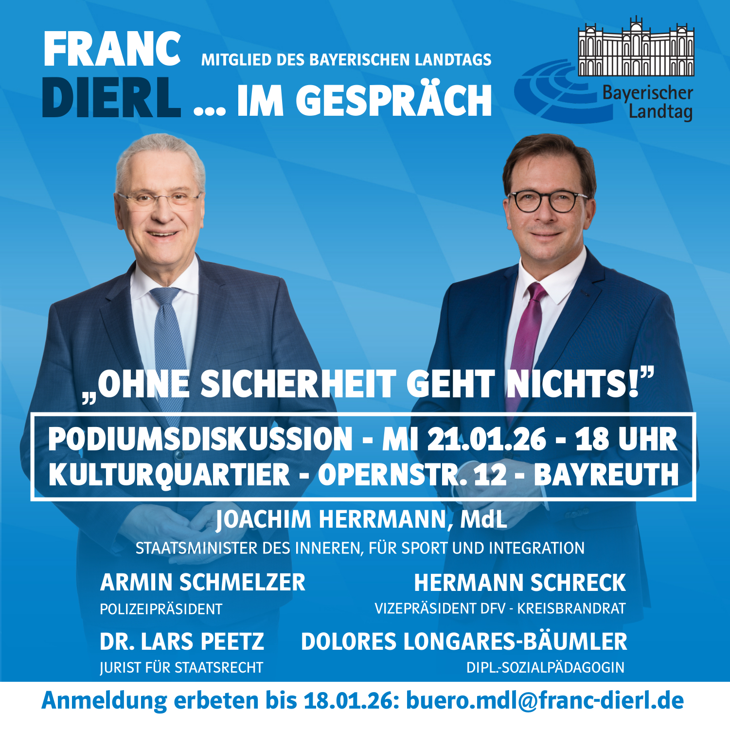 Vor diesem Hintergrund lädt Landtagsabgeordneter Franc Dierl zur öffentlichen Podiumsdiskussion „Ohne Sicherheit geht nichts!“ ein, für die Joachim Herrmann, MdL, Staatsminister des Innern, für Sport und Integration gewonnen werden konnte. Ebenso diskutieren Armin Schmelzer, Polizeipräsident Oberfranken, Herrmann Schreck, Kreisbrandrat des Landkreises Bayreuth, Dolores Longares-Bäumler, Dipl.-Sozialpädagogin bei der Caritas, Dr. Lars Peetz, Jurist für Staatsrecht, über das Thema Innere Sicherheit mit besonderem Blick auf aktuelle Entwicklungen, politische Strategien und deren Bedeutung für die Bürgerinnen und Bürger vor Ort.Die Veranstaltung findet am Mittwoch, 21.1.2026 um 18 Uhr im Kulturquartier, Opernstraße 12, in Bayreuth statt.